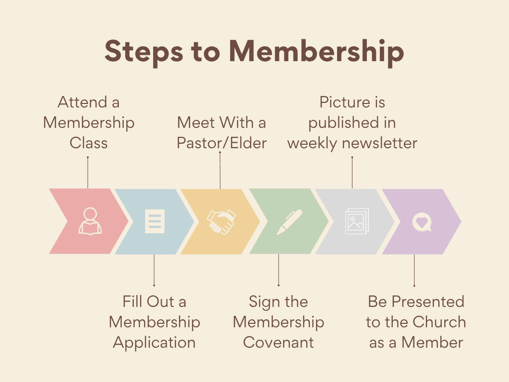 After the Membership class, you'll be asked to fill out a Membership Application, Meet with a Pastor/Elder, Sign the Membership Covenant and then Be Presented to the Church as a Member.